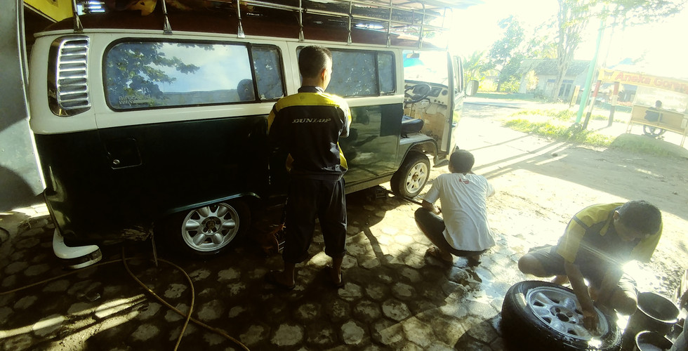 Kami harus bergegas mencari bengkel dikarenakan ban cadangan yang kami bawa juga kempes. Setelah satu ban teratasi kamipun akhirnya bisa berangkat ke bengkel terdekat untuk mengganti seluruh ban demi keamanan berkendara karena besok kami hendak melanjutkan perjalanan.